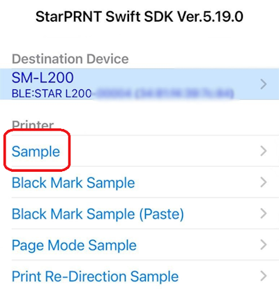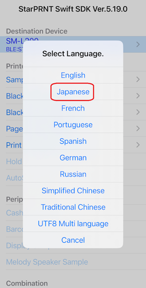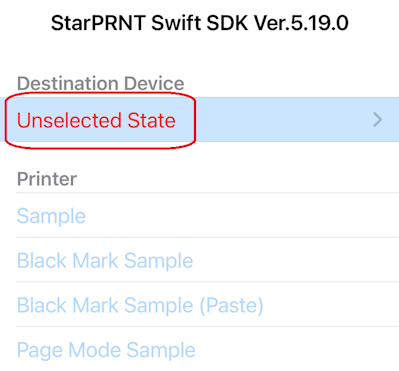 ①StarPRNT SDKアプリを起動後上部にある赤字「Unselected State」を選択します。