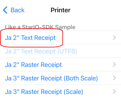 ③「JA2″ Text Receipt」を選択するとテスト印刷が可能です。