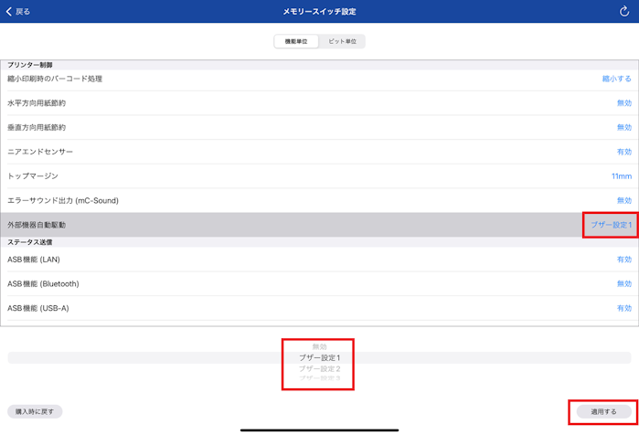 [無効]から[ブザー設定1]、[ブザー設定2]、[ブザー設定3]のいずれかを選択後、[適用する]を選択します。